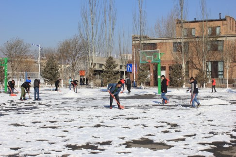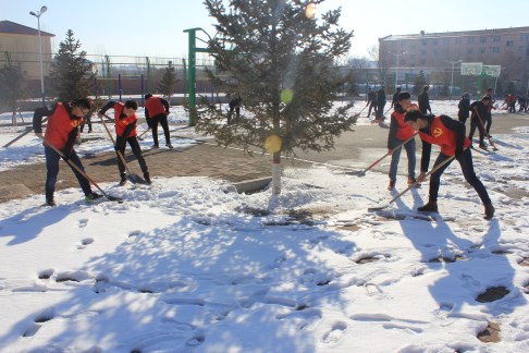 初春的天气依然寒冷,但是大家都热情高涨、积极主动地按照分工到达指定场地,手拿铁锹、雪铲相互配合,篮球场上奏响了动人的“交响乐”。整个过程,大家认真地清理着每个角落,经过两个多小时的努力,冰雪已被基本清除干净。