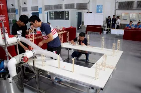 本次竞赛以“渡槽支承系统设计与制作”为赛题。比赛要求参赛作品支承起装满水后重达50kg的水管,经过承台上A、B两点并坚持20秒。33支参赛队伍依次摆出精巧的结构模型:拱式、梁式、悬索式等各种桥梁设计,圆柱架、三角架、梯形架等各种支承结构设计,充分展现了参赛选手的精妙设计和精巧的制作手工。现场加载环节中,选手们拧螺钉,滴胶水,有条不紊地安装作品,注水进行加载……