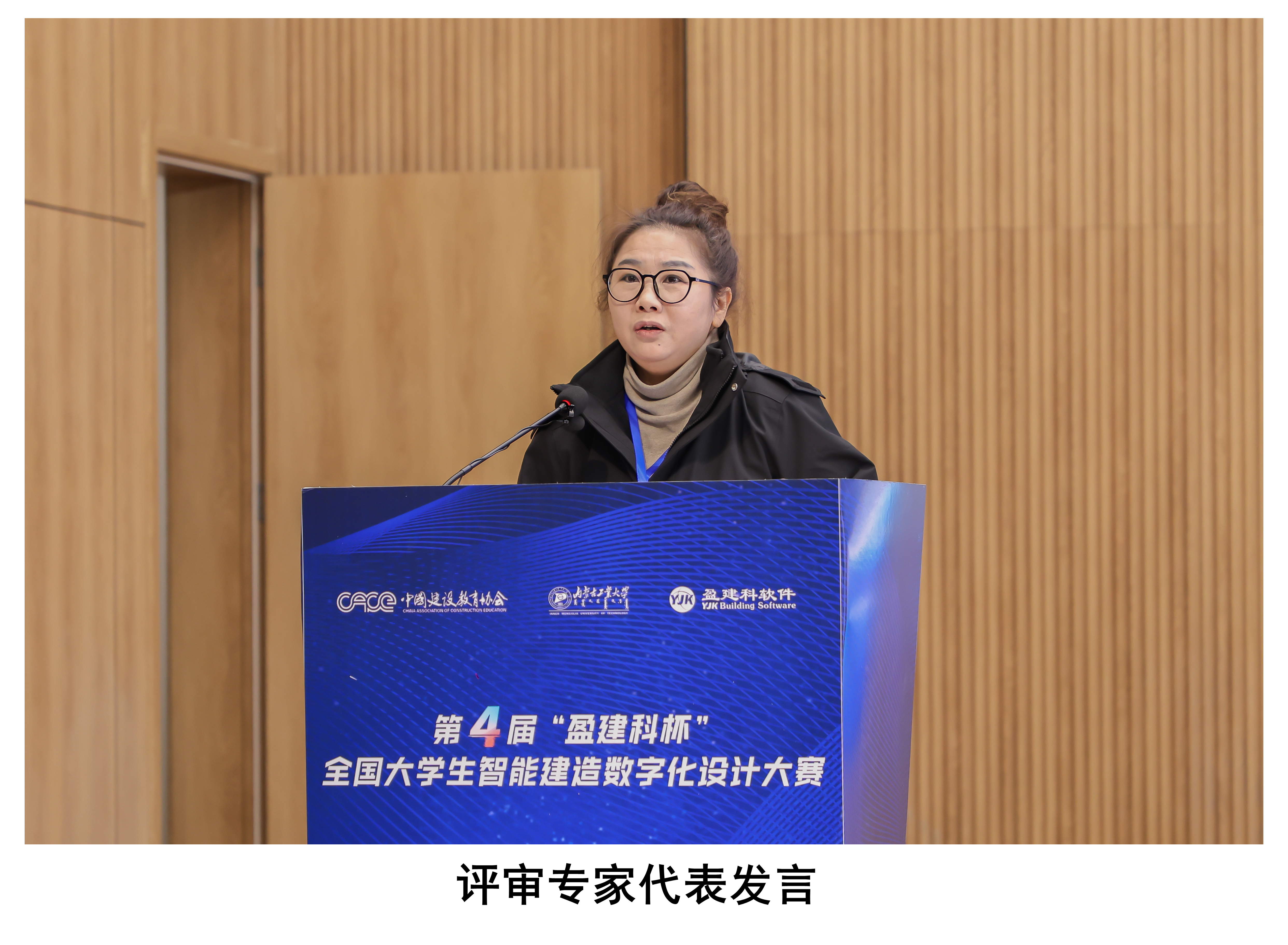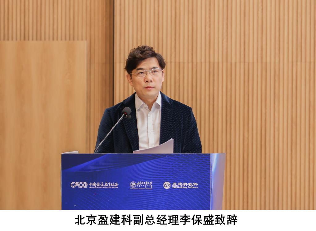 协办单位北京盈建科软件股份有限公司副总经理李保盛致辞。他表示,将进一步深化产教融合,扩大校企合作范围,创新人才培养模式,为高校提供更优质的软件支持、更专业的技术服务,与教育界、产业界同仁并肩携手,优化智能建造人才培养体系,为行业高质量发展注入源源不断的青春力量。