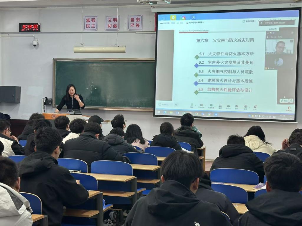 课堂上,时金娜老师以线下教室为教学主场,围绕 PPT 中 “火灾特性与防火基本方法”“室内外火灾发展及其蔓延” 等章节要点,结合内蒙古地区 “寒冷气候下建筑保温材料防火兼容性”“草原民居防火布局” 等地域工程特点,拆解基础理论与本地实践的衔接逻辑;而线上接入的刘朝峰教授,则聚焦 “结构抗火性能评估与设计” 板块,补充了京津冀地区大型公共建筑抗火加固工程案例,同时分享了其团队在 “3D 仿真模拟结构抗火失效过程” 中的最新研究成果,将行业前沿技术转化为课程可感知的教学内容。