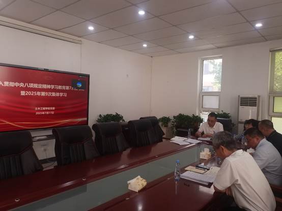 7月17日,土木工程学院党委理论中心组召开深入贯彻中央八项规定精神学习教育读书班暨2025年第9次集体学习会。会议采取视频学习、解读研读、警示教育等形式进行,学院党委委员参加学习,学院党委书记张翔主持会议。